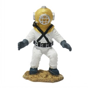 Betta White Diver is a static ornament, depicting an underwater explorer from a bygone age. Approximate dimensions: 7.3cm (w) x 4.6cm (d) x 10.3cm (h).